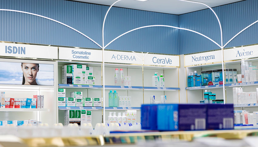 El interiorismo de la tienda, obra del estudio CuldeSac, destaca por aportar a cada sección su identidad visual. Decorada con materiales nobles, la tienda recrea una atmósfera vibrante gracias a la luz y los soportes tecnológicos en cada uno de las áreas diferenciadas: selectivo, parafarmacia, eco y beauty, aunque integradas en la estética corporativa de Druni.