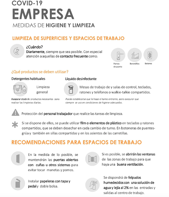 Las empresas deberán asegurar una correcta limpieza de las superficies y espacios de trabajo, incidiendo sobre todo en aquellas zonas donde hay más contacto, como pomos de puertas y barandillas.