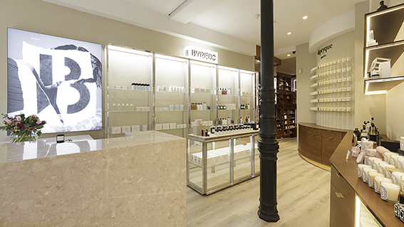 Diptyque y Byredo tienen el protagonismo mayor, con una exposición más amplia y una ambientación diferenciada. En el caso de Dyptique, los expositores son de madera con embellecedores de latón. Destaca una estantería curva, reservada para albergar las velas de la firma. La exposición de la firma sueca Byredo recupera el tradicional mostrador delante de los estantes.