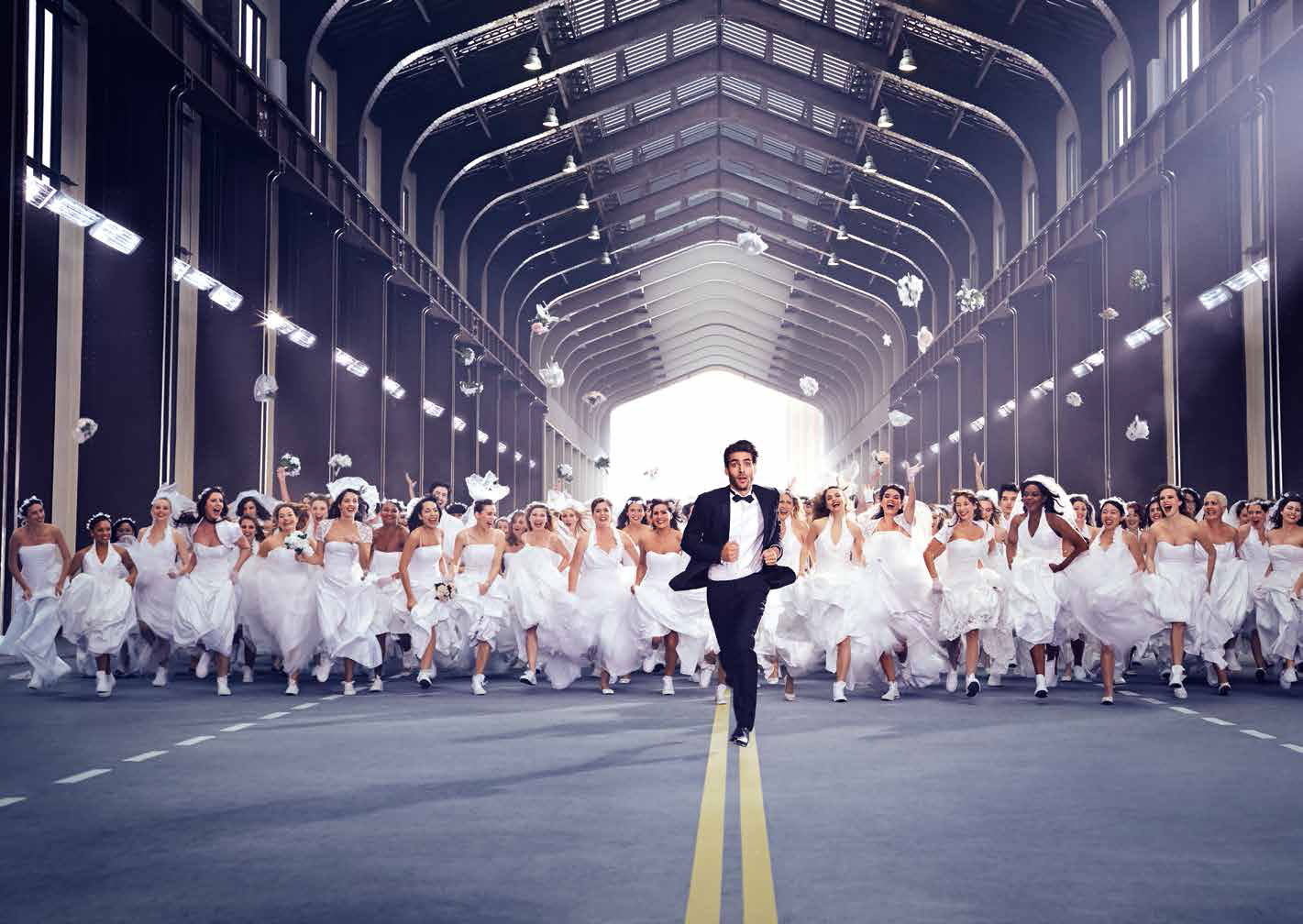 El visual publicitario calca un fotograma de la película El soltero, una comedia de Chris O’Donnel y Renée Zellweger. En este caso, las novias que persiguen literalmente al hombre ideal son 160 trabajadoras de Guerlain.