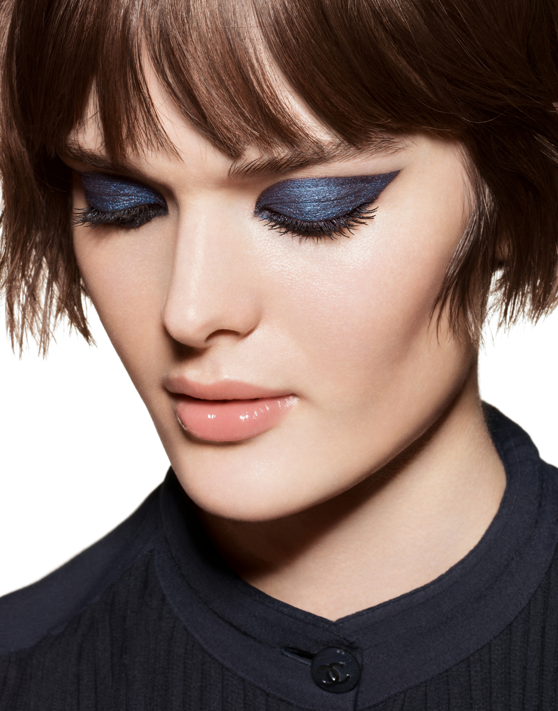 Delineamos los ojos con Ligne Graphique Dream Blue, para destacar el párpado desnudo, y con Noir-Noir, con el que podemos estilizar un maquillaje de ojos ahumados. Por último, las pestañas se enfatizan con las máscaras Le Volume Ultra Noir y Blue Night.