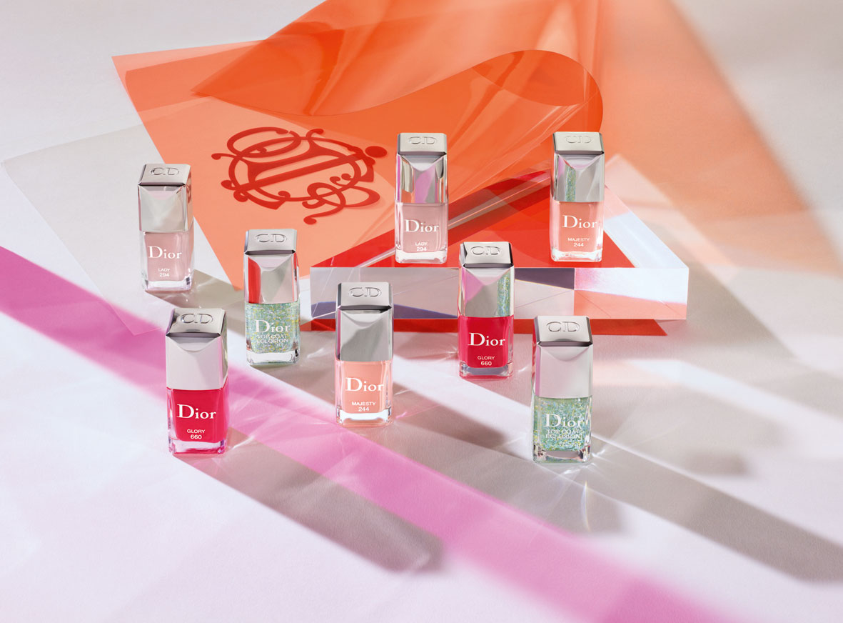 El esmalte de la temporada es Topcoat Eclosion, un gel transparente con micro-confetis de color amarillo, verde y blanco, cuyo efecto «floración» se potencia al aplicar sucesivamente varias capas. Además, Dior propone tres nuevos colores: un malva delicado (Lady), un rosa suave (Majesty) y un rojo capuchino cargado de luz (Glory).