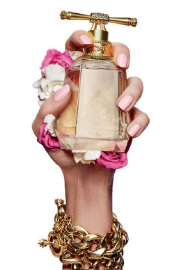 El sofisticado frasco toma su forma de los tapones-decantadores ya típicos en la marca. Su diseño invertido y con toques distintivos culminan con el emblemático cierre joya y la cadena de Juicy Couture.