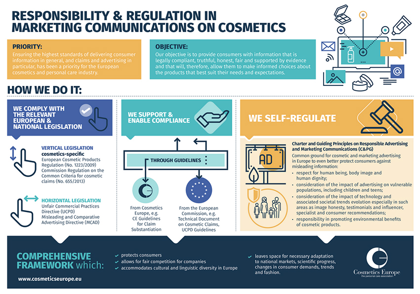 Partiendo de una guía de buenas prácticas publicada en al año 2012, Cosmetics Europe ha actualizado el texo para tener un marco de regulación más amplio que contempla nuevos aspectos sobre marketing digital. Esta guía ha sido desarrollada a la vez que la Comisión Europea estaba redactando el Reglamento de Criterios Comunes, por lo que ambos textos coinciden en puntos fundamentales como en los principios de honestidad, veracidad, justificación de las afirmaciones y elección informada, aspectos que se han convertido en requisitos legales.