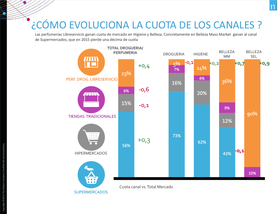El canal de perfumerías de libreservicio es el que mejor comportamiento ha experimentado respecto a 2014 en lo que respecta a higiene y belleza, con ese incremento del 2,7% en valor (en belleza, sube hasta el 3,5%), superando al supermercado (+1,3%) el que ha venido siendo el mejor canal durante los últimos años. Las ventas en las tiendas tradicionales registraron una caída del 7,7%, mientras que en los hipermercados se mantuvieron estables.