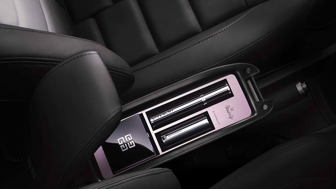 La personalización continúa en el interior: desde la banda del salpicadero que destaca con su tonalidad rosa anodizada, hasta las alfombrillas estampadas con el logo, sin olvidar la iluminación LED de los dos espejos de cortesía, que alumbrarán los retoques del maquillaje que se pueden realizar con el kit que esconde el reposabrazos compuesto por la máscara de pestañas Noir Couture, los polvos Le Prisme Visage, el labial Le Rouge y una laca de uñas tono Whisper, creado exclusivamente por Givenchy para la ocasión.