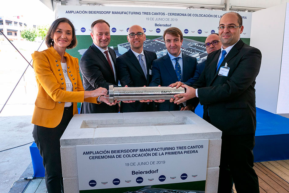 El grupo alemán Beiersdorf tiene grandes planes para la fábrica de Tres Cantos en Madrid. La que es su tercera planta más importante de Europa recibirá 55 millones de euros para acometer una ampliación hasta el año 2022, que le permita crecer de forma competitiva y sostenible. Ayer tuvo lugar el acto de colocación de la primera piedra del proyecto, al que asistió la Ministra de Industria, Reyes Maroto.