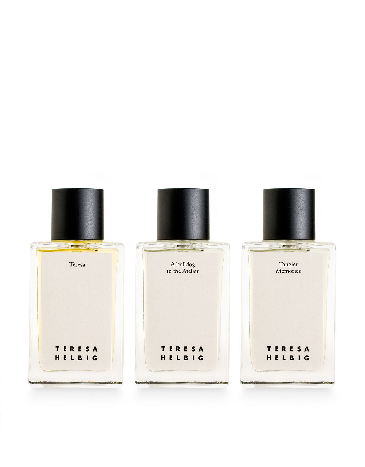 Teresa, el retrato olfativo de la diseñadora, une neroli, bergamota y mandarina amarilla que evolucionan a un corazón de flor de cananga, absoluto de semillas de ambrette, pimienta y bayas. La composición reposa sobre absoluto de bálsamo de benjuí, extracto de roble y tabaco.